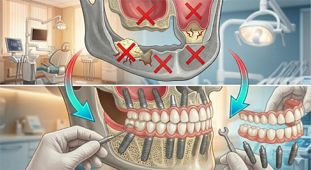 Patients with severe bone loss in the upper and lower jaw are often told that dental implants are not possible without bone grafting or sinus lift surgery. However, with modern advancements in implant dentistry, immediate loading dental implants in severe bone loss cases have become highly predictable and successful. Today, patients can receive full mouth dental implants without bone grafting, avoiding long treatment delays, multiple surgeries, and uncertain outcomes.